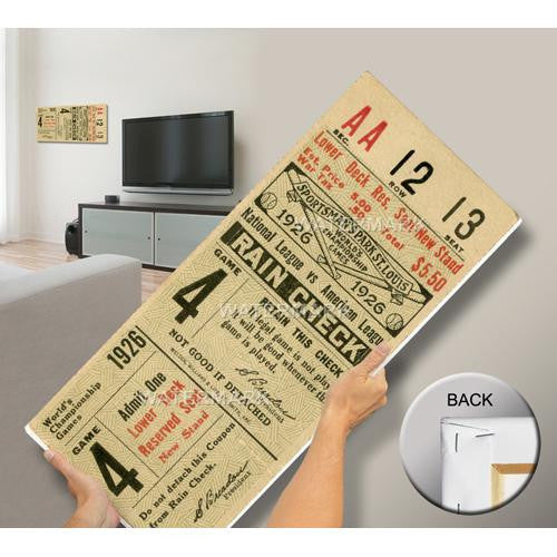 Officially licensed by MLB Mega Tickets are cutting-edge wall art. They are created from authentic game tickets enlarged 500% printed on archival canvas and professionally stretch-mounted. Perfect for autographs. Overall Size: 14(W) x31(H) x0.75(D).