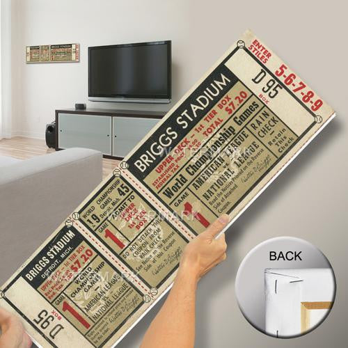 Officially licensed by MLB Mega Tickets are cutting-edge wall art. They are created from authentic game tickets enlarged 500% printed on archival canvas and professionally stretch-mounted. Perfect for autographs. Overall Size: 10(W) x33(H) x0.75(D).