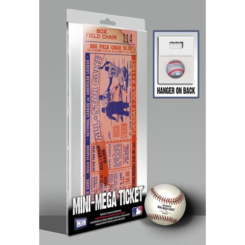 Held at Sportsman's Park/Busch Stadium the 1957 All-Star Game is often remembered for the ballot-stuffing antics of Cincinnati Reds fans who helped get seven of their players into the starting lineup. Commissioner Ford Frick vetoed two of the selections. On the field the AL held off a 9th inning rally to win 6-5. Memorable Moments include Hank Aaron and Willie Mays named to the starting lineup replacing the Reds Wally Post and Gus Bell via the commissioner's office. This 1957 All-Star Game Mini-Mega Ticket commemorates the occasion. Overall Size: 5 (W) x 14 (H) x 1/4 (D) Officially licensed by MLB Mini-Mega Tickets are made from authentic MLB tickets. Mini-Mega Tickets are approximately 200% larger than their original ticket size and printed directly on 1/4-inch thick rigid PVC board. They are perfect for autographs. Mini-Mega Tickets make great wall art as they include a flexible wall hanger on their back. *Product shown in packaging