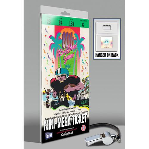 The 80th Rose Bowl held January 1 1994 pitted the Wisconsin Badgers versus the UCLA Bruins. Wisconsin won 21-16. Wisconsin running back Brent Moss was named Player of the Game. This Mini-Mega Ticket commemorates the event. Overall Size: 6 (W) x 11 1/2 (H) x 1/4 (D) Officially licensed by the Collegiate Licensing Company's College Vault program Mini-Mega Tickets are made from authentic NCAA tickets. Mini-Mega Tickets are approximately 200% larger than their original ticket size and printed directly on 1/4-inch thick rigid PVC board. They are perfect for autographs and can be used as a team-signed item. Mini-Mega Tickets make great wall art as they include a flexible wall hanger on their back. *Product shown in packaging