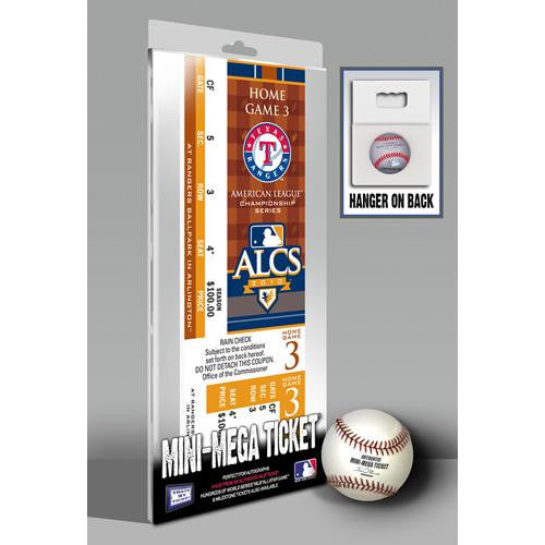 For the first time in franchise history the Texas Rangers are American League Champions and they did it in front of their own fans clinching the pennant at the Ballpark in Arlington in dramatic fashion. This Mini-Mega Ticket commemorates the Rangers 2010 ALCS title. Overall Size: 4 5/8 (W) x 14 (H) x 1/4 (D) Officially licensed by MLB Mini-Mega Tickets are made from authentic MLB tickets. Mini-Mega Tickets are approximately 200% larger than their original ticket size and printed directly on 1/4-inch thick rigid PVC board. They are perfect for autographs. Mini-Mega Tickets make great wall art as they include a flexible wall hanger on their back. *Product shown in packaging