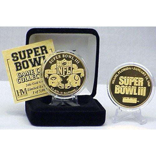 The Highland Mint presents the 24kt Gold Super Bowl III flip coin. THESE UNIQUE GAME COINS COMMEMORATE EACH INDIVIDUAL SUPER BOWL PLAYED! THE COIN IS INDIVIDUALLY NUMBERED AND FEATURES THE SUPER BOWL LOGO FOR THAT YEAR AS WELL AS THE LOCATION AND DATE OF THE GAME. Each Minted coin is triple struck to feature the finest detail. Made of 24kt Gold overlay the coin combines a beautiful mirrored and frosted finish. Each coin measures 1.5in diameter presented in a capsule to preserve its Mint condition. It is then displayed in a black velour jewelry box includes a Certificate of Authenticity. Is limited to 5000 for each year and is officially licensed by the NFL.