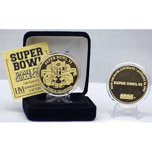 The Highland Mint presents the 24kt Gold Super Bowl VI flip coin. THESE UNIQUE GAME COINS COMMEMORATE EACH INDIVIDUAL SUPER BOWL PLAYED! THE COIN IS INDIVIDUALLY NUMBERED AND FEATURES THE SUPER BOWL LOGO FOR THAT YEAR AS WELL AS THE LOCATION AND DATE OF THE GAME. Each Minted coin is triple struck to feature the finest detail. Made of 24kt Gold overlay the coin combines a beautiful mirrored and frosted finish. Each coin measures 1.5in diameter presented in a capsule to preserve its Mint condition. It is then displayed in a black velour jewelry box includes a Certificate of Authenticity. Is limited to 5000 for each year and is officially licensed by the NFL.