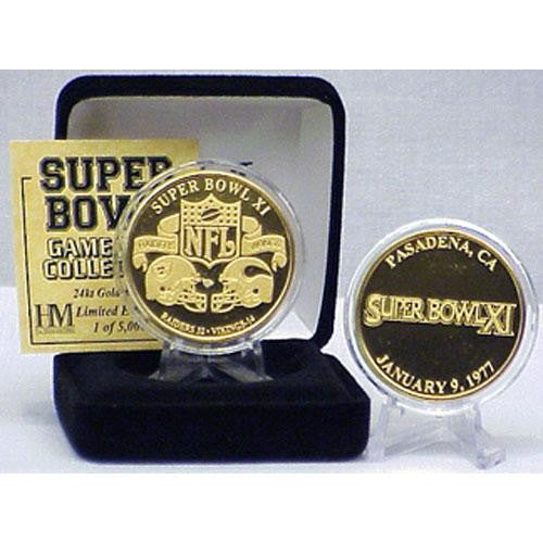 The Highland Mint presents the 24kt Gold Super Bowl XI flip coin. THESE UNIQUE GAME COINS COMMEMORATE EACH INDIVIDUAL SUPER BOWL PLAYED! THE COIN IS INDIVIDUALLY NUMBERED AND FEATURES THE SUPER BOWL LOGO FOR THAT YEAR AS WELL AS THE LOCATION AND DATE OF THE GAME. Each Minted coin is triple struck to feature the finest detail. Made of 24kt Gold overlay the coin combines a beautiful mirrored and frosted finish. Each coin measures 1.5in diameter presented in a capsule to preserve its Mint condition. It is then displayed in a black velour jewelry box includes a Certificate of Authenticity. Is limited to 5000 for each year and is officially licensed by the NFL.