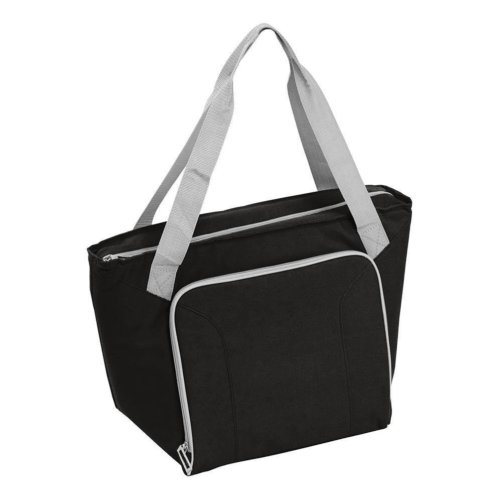 Made of 600 denier polyester fabric and lined with heat sealed leak proof liner. There is an additional zipper pocket for storage with a screen printed logo and two straps for easy carrying. Sized to hold 30 12oz. cans plus ice.