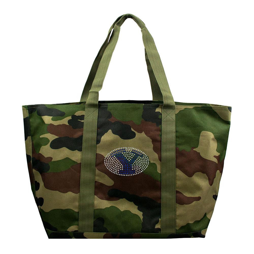 Fashionable fans know that camo is always in style. This tote contrasts a vintage camo pattern with crystallized team logo to get one stylish big bag! This bag is made from a durable polyester weave with a water resistant PVC-backed lining.