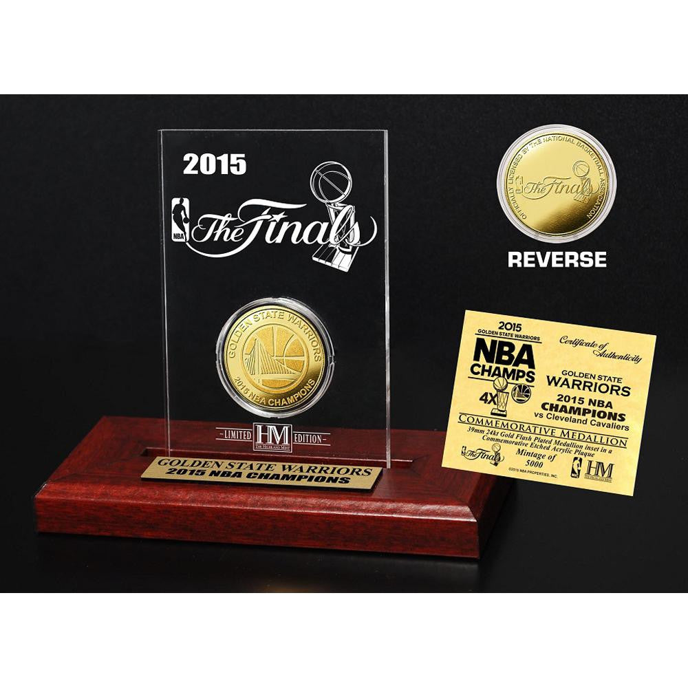Limited edition! The minted 39mm 2015 NBA Finals Champions gold flash plated commemorative coin is minted to highest standards in minting tradition! The gold plated coin is minted with the official 2015 NBA ?Champions? logo on the obverse and the NBA ?Finals? commemorative logo on the reverse. Each coin is individually numbered on the edge and protected in an acrylic capsule to preserve its condition. A 3?x5? custom etched acrylic with a wood display stand features the coin in its custom die cut opening. Therefore the coin can replaced and removed from the display. The wood base includes an engraved nameplate. Limited Edition of 5000, each gold coin is accompanied by a certificate of authenticity and is officially licensed by the NBA. Proudly made in the U.S.A. by The Highland Mint!