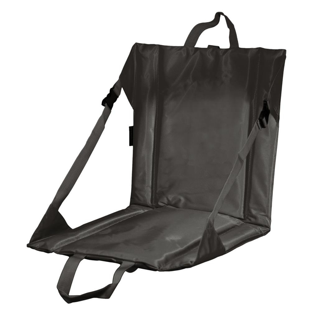 Nylon fabric with padded cushion 16 L x 14.5 W seat and cushioned back support. Features velcro strap to secure seat to bleacher and adjustable reclining straps. School logos on front and back of seat. Velcro closing strap and durable handle on top for