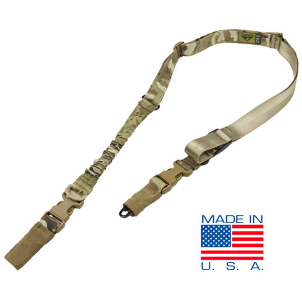 Coverts from two point to single point sling. Transition-loc with pull-tab allows quick adjustments. Single bungee construction. HK snap hook adapter covered with elastic sleeve. Side-release buckle to release adapter.