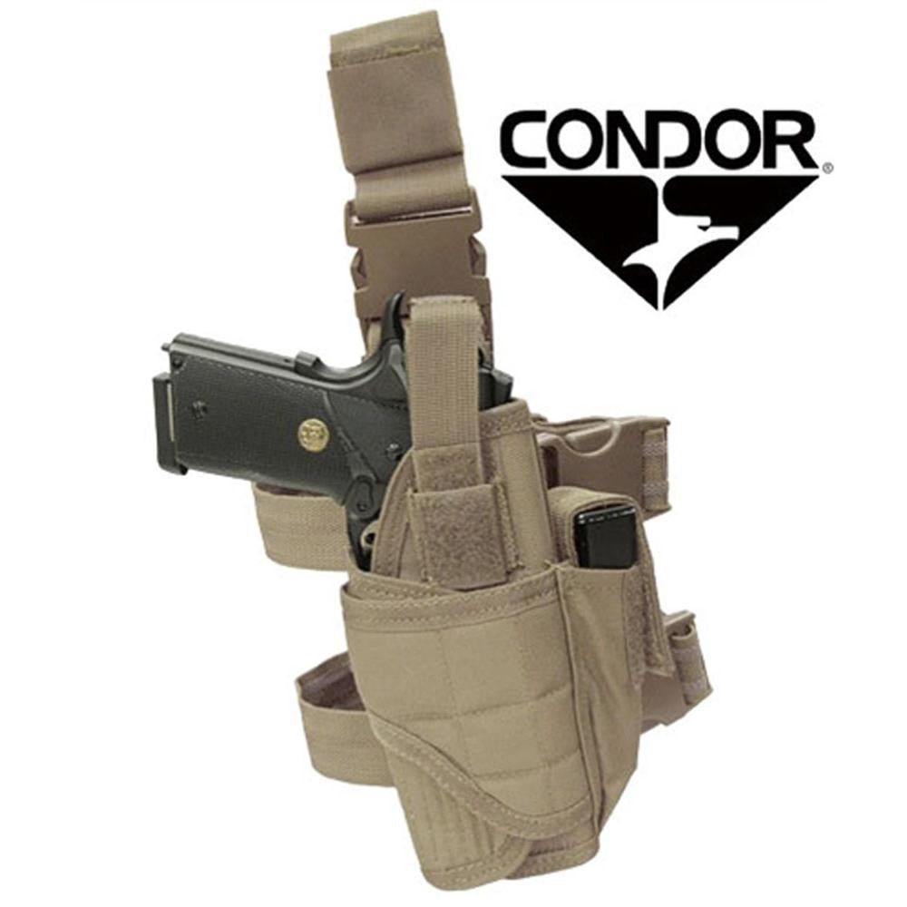 Wrap-Around design to fit pistols with laser or flashlight mount. Retention system with additional hook and loop strap to secure weapon. Fully adjustable leg strap with non-slip rubber lining and quick release buckle. One magazine pouch, with adjustable hook and loop flap. Will fit Medium or Large size pistol.