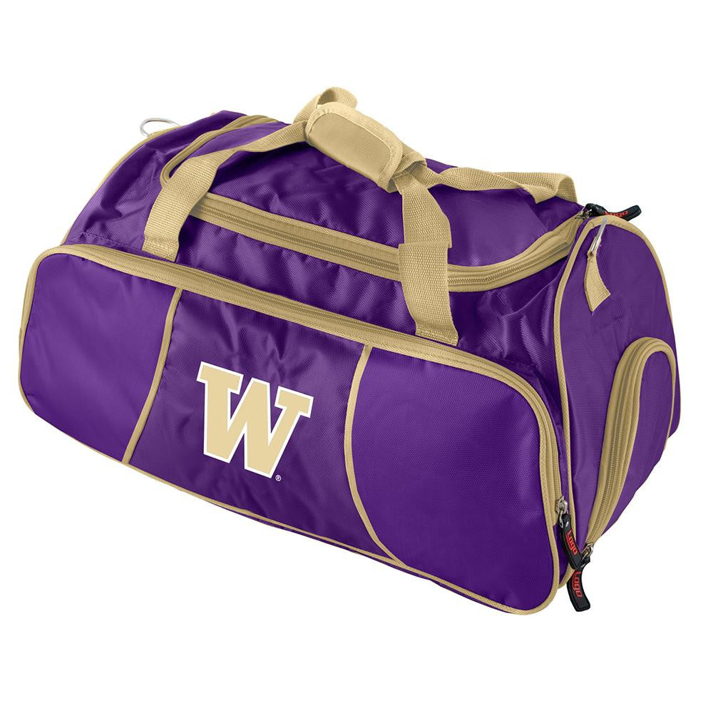 Made of 600 denier polyester and measuring 21x11x12 for ample storage this athletic duffel features two handles and a removable shoulder strap to make carrying easy plus luggage attachment band on the back of the body. Large front pocket includes holders for pens ID and coins. Separate bottom compartment for tennis shoes. Offered in team colors with embroidered team logo on front of duffel.