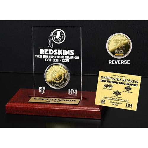 Limited Edition of 5000! A 24KT Gold plated Washington Redskins Super Bowl Champs Coin is beautifully displayed in a 3.5in x 5in Acrylic with custom Team Logo Archival Etching (Engraving). Each is delivered with a cherry wood base with an engraved nameplate as well as a Certificate of Authenticity. A Limited Edition of 5000 and Officially Licensed by the NFL.